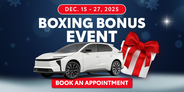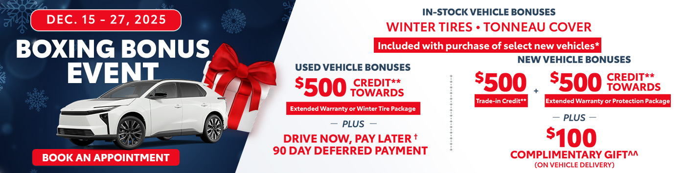 Welcome to the Boxing Bonus Event. This Boxing Week, enjoy exclusive bonuses and stackable savings on a wide selection of in-stock, new, and used vehicles. From advanced electrified models to dependable pre-owned options, this event offers added value across the lineup.
